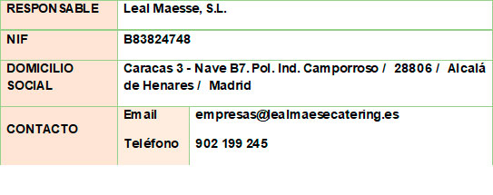 Los titulares de los datos personales obtenidos, podrán ejercer sus derechos de protección de datos personales dirigiendo una comunicación por escrito al domicilio social de Leal Maesse, S.L. o al correo electrónico habilitado a tal efecto, empresas@lealmaesecatering.es.