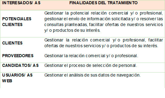 En Leal Maesse, S.L., dependiendo de la categoría de persona interesada de que se trate, tratamos la información que nos facilita con las siguientes finalidades: