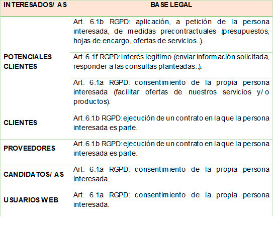 La base legal para el tratamiento de sus datos personales, dependiendo de la categoría de interesado/a de que se trate, puede ser: